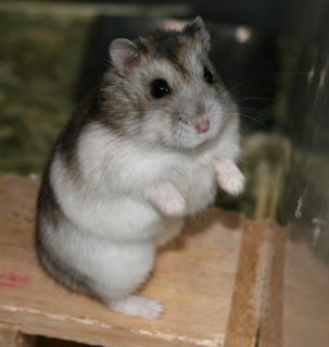 我が家にやった来た五番目のハムスター。ハムシロウと同じエスポット富士店より第四代将軍として招いた。初代ハムべえ以来のノーマルグレーである。2008年10月より地下型巣箱を導入。地下の生活を堪能していた。2009年3月2日深夜(正確には3日0時40分過ぎ)、いつものように世話をしようとすると倒れていた。頭のある辺りに血が流れていた。抱き起こしてみたが、すでに冷たくなっていた。恐らく回し車かかじり木ステージからの転落死と考えられる。人間なら76歳であった。 | |