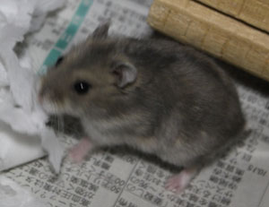 二代目ハムべえ、ハムしちに続く三番目のブルーサファイヤ。ショップにいた中では一番元気だったが、ハムきちと違い、家までの車中では非常に大人しくしていた。ケージに入れると、巣材をトイレに持ち込んで家にしてしまった。 2014年の年末あたりから歩き方がぎこちなくなり、毛艶も悪くなってきた。獣医の指示で栄養価の高い食べ物を与えるなどしていた。2015年2月26日に巣箱の通路で動いているのを確認した後、翌日も同じ位置で動いておらず、死亡を確認。推定誕生日から11ヶ月、人間なら34歳の若すぎる死であった。 |